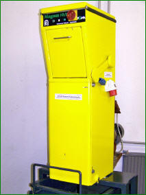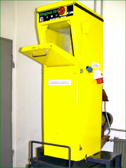 POMA-Porschendorf produziert die Dosenpressen Magnus 10/L und Magnus 30/L zur Verpressung von Dosen und Gebinden bis 10 bzw. 30 Liter. Mit diesen elektrisch betriebenen Pressen ist die Volumenreduzierung der eingebrachten Dosen bis zu 90% möglich. In der auf dem Foto dargestellten Grundversion wird die Presse Magnus 10/L mit einem handelsüblichen 0,2m⊃3; Sammelbehälter angeboten. In dieser Variante kann die Dosenpresse ohne weitere Vorbereitungen im Freien oder in geschlossenen Räumen aufgestellt werden. Wegen ihrer "normalen" Höhe ist die Beschickung mit leeren Dosen von einer Person ohne Hilfsvorrichtung manuell möglich. Der Sammelbehälter kann den Kundenwünschen entsprechend angepasst werden.